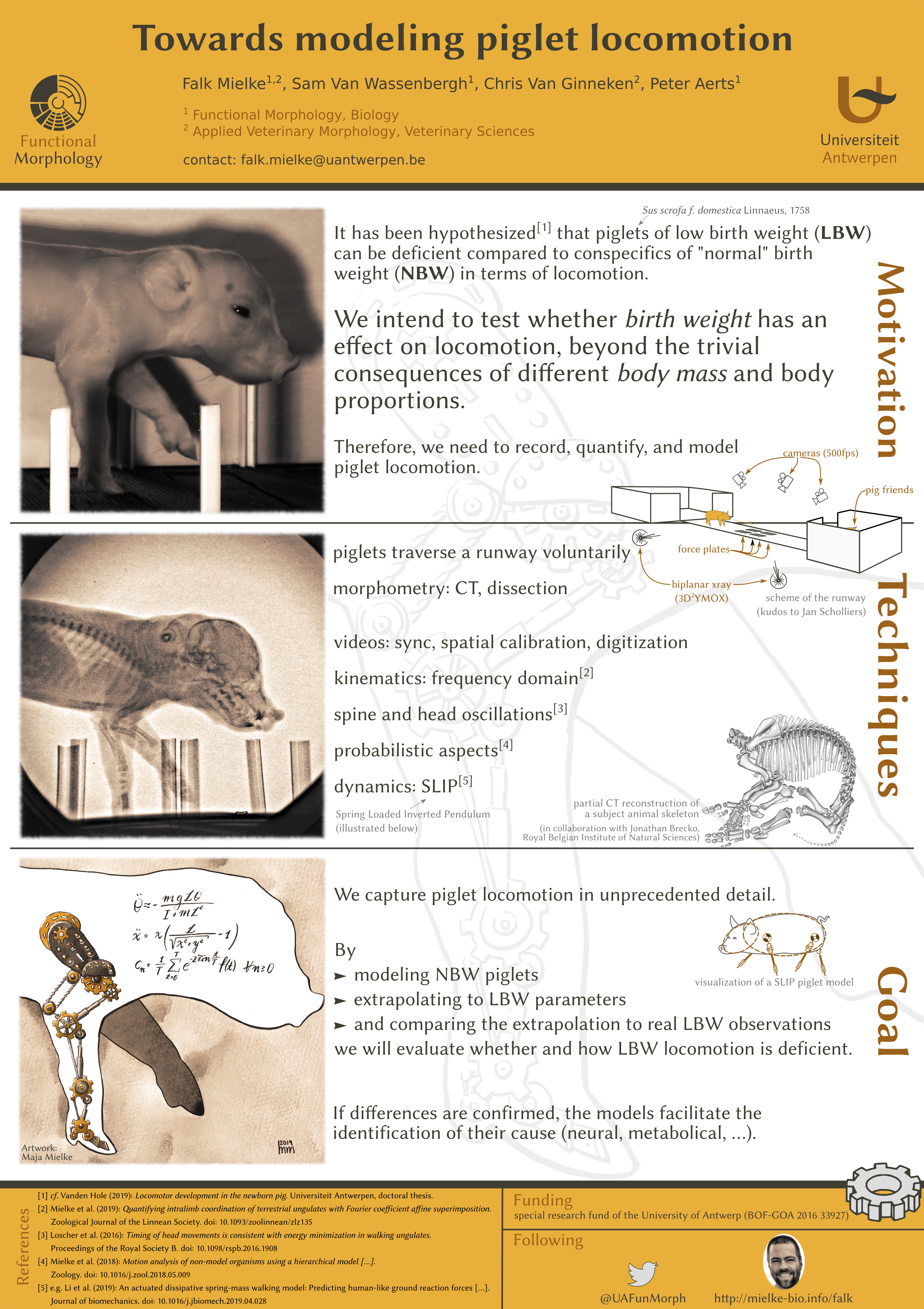 From the end of 2017, until March 2024, I was a PhD Student at the University of Antwerp. I studied the locomotion of piglets with various non-invasive techniques (force recordings, high-speed videography, x-ray videos, inertial measurement sensors). Besides my regular project, many side tracks lead me to explore things that are exciting, challenging, sometimes frustrating, or even beautiful. Usually, I acquire technical skills or learn something about the broad general context of my studies. Some of these side tracks are publishable, others are not; but even if not, acquiring technical skill is personal achievement.