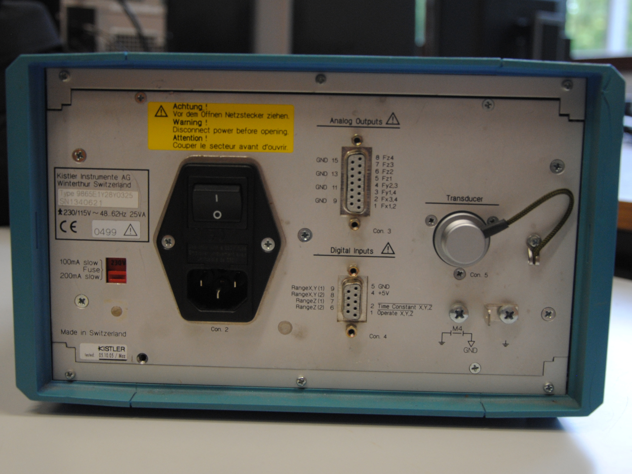 Amps could in principle be exchanged for less proprietary brands (or even self-tinkered devices). In my case, availability made the choice again, and I preferred to stick with the Kistler ones we have to ensure smooth transmission of the force data. These amps are excellent products after all, and I will forgive Kistler that I had to open the casing of a brand new one (fresh from vacuum bag) to retrieve a plug fixation screw that had not been properly tightened.