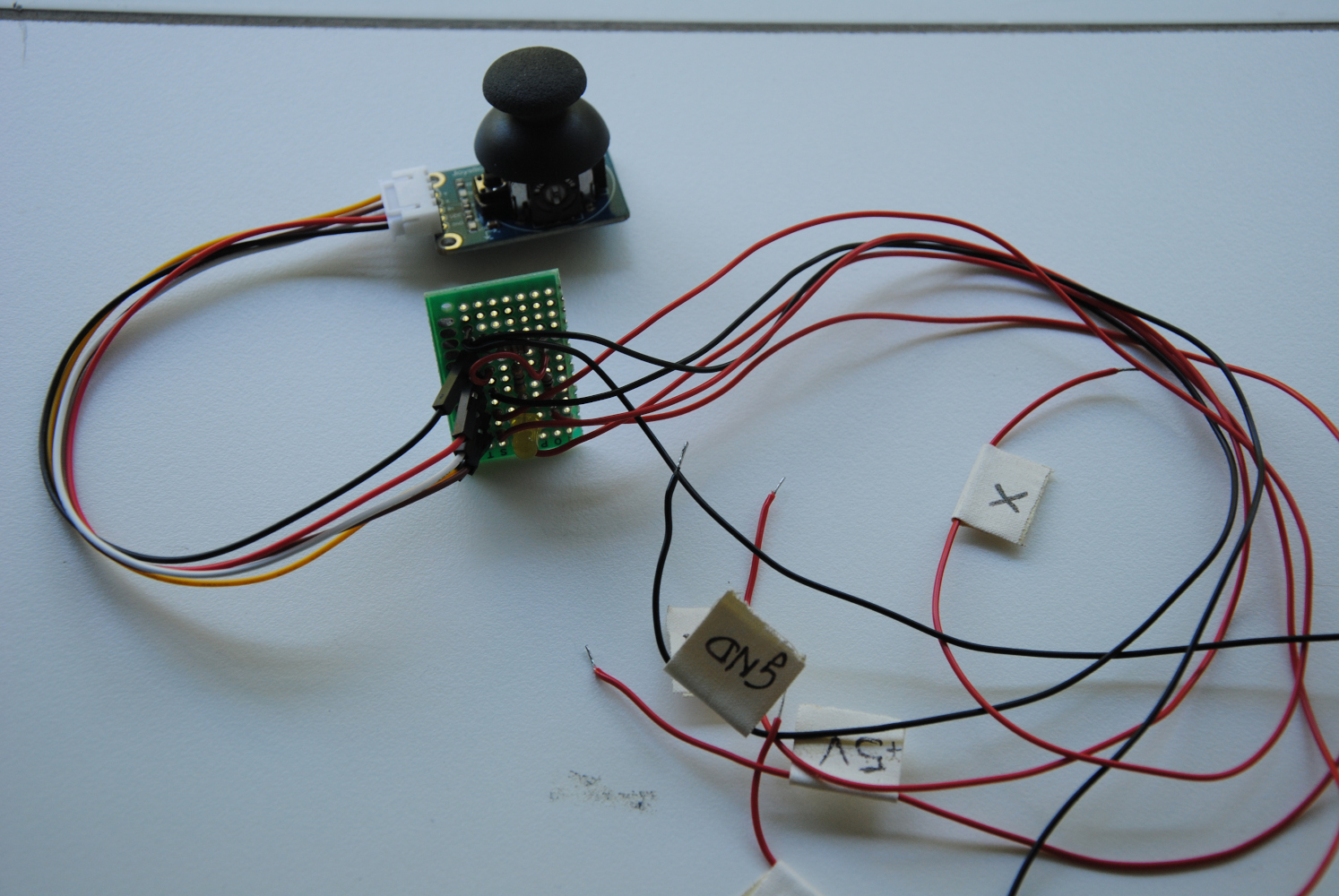 It has two horizontal axes (\(x\), \(y\)) that give quasi-analog signals and a push-function (\(z\)) that can serve as a trigger. I used a voltage divider to get from \(5V\) (DAQ) to \(3V\).