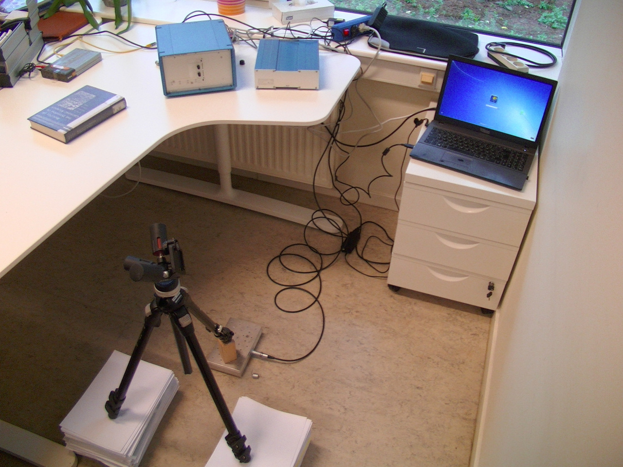 This was one of my first installations - today, I consider it more a kind of art than relevant measurement. I had carefully measured tripod angles, weighted the tripod, had meticulously piled books and papers to level out the feet, fixed a wooden socket on the force plate, and even made sure that all legs of the tripod get the same share of its weight.