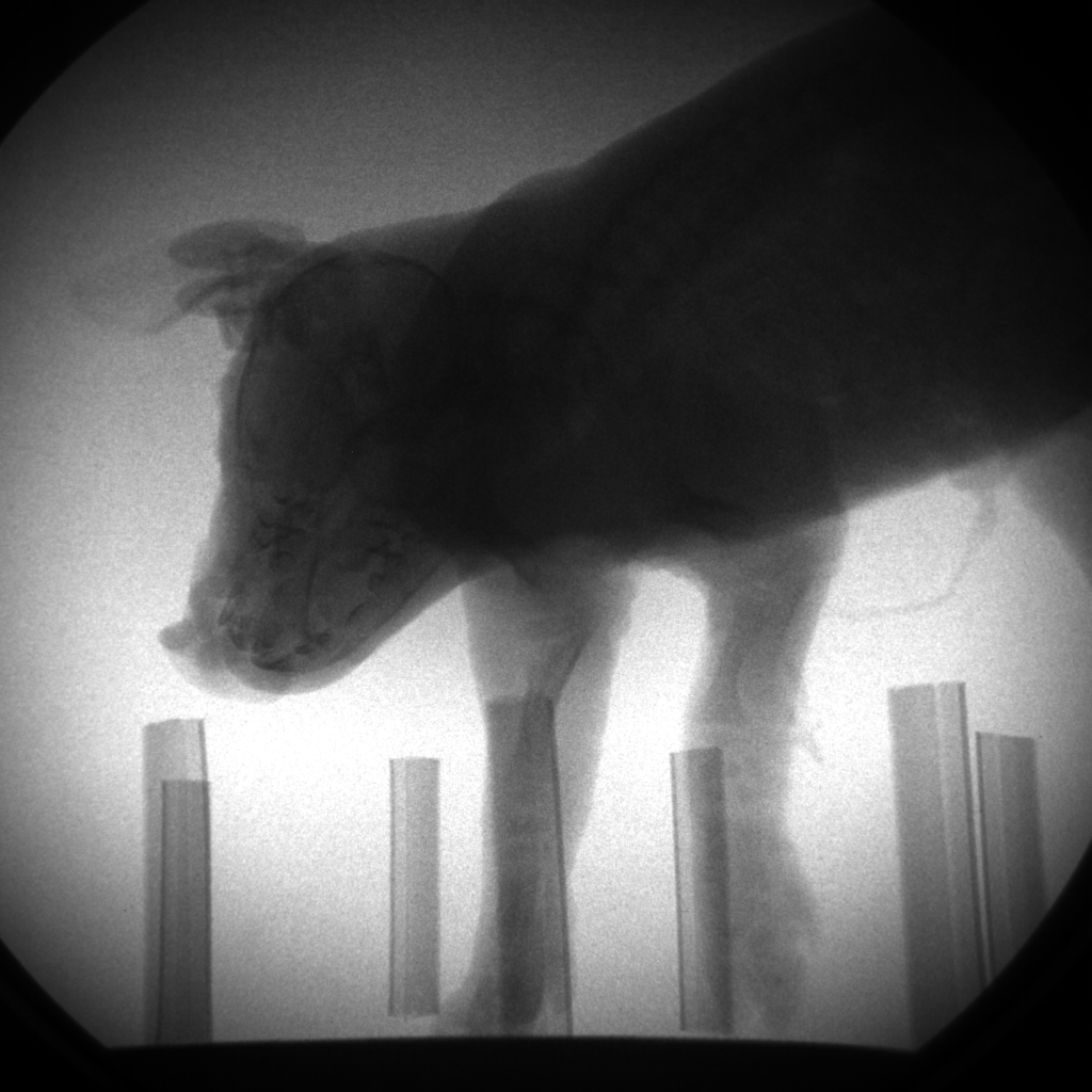 The problem is that limbs and body of our subject animals have different thickness, and in consequence the cumulated x-ray absorption differs. Therefore, it is challenging to choose an exposure that allows the simultaneous visualization of limbs and the main body. Because our project is about locomotion, we decided rather intuitively to select an exposure that would resolve the limbs well.
