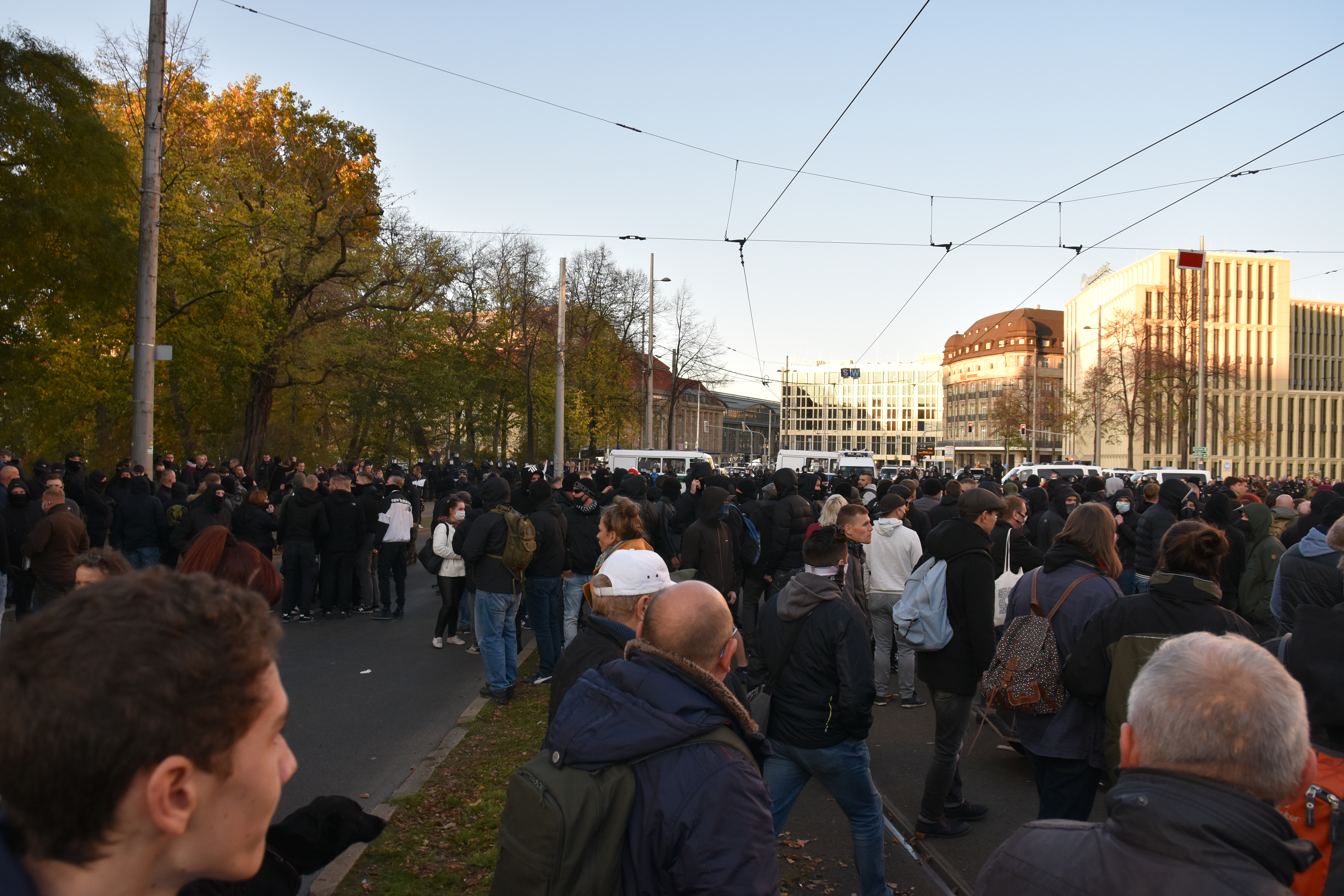 - For example, it was announced the evening before, publicly and seemingly official on regional media, that the event was moved to a parking space at “Leipzig Messe”. That was clearly not true, which I luckily saw when passing there with the train. I heard, but cannot confirm, that video and audio equipment on Georgiring and Goethestrasse (used for remote viewing of the main stage) had been removed because of the pending relocation.