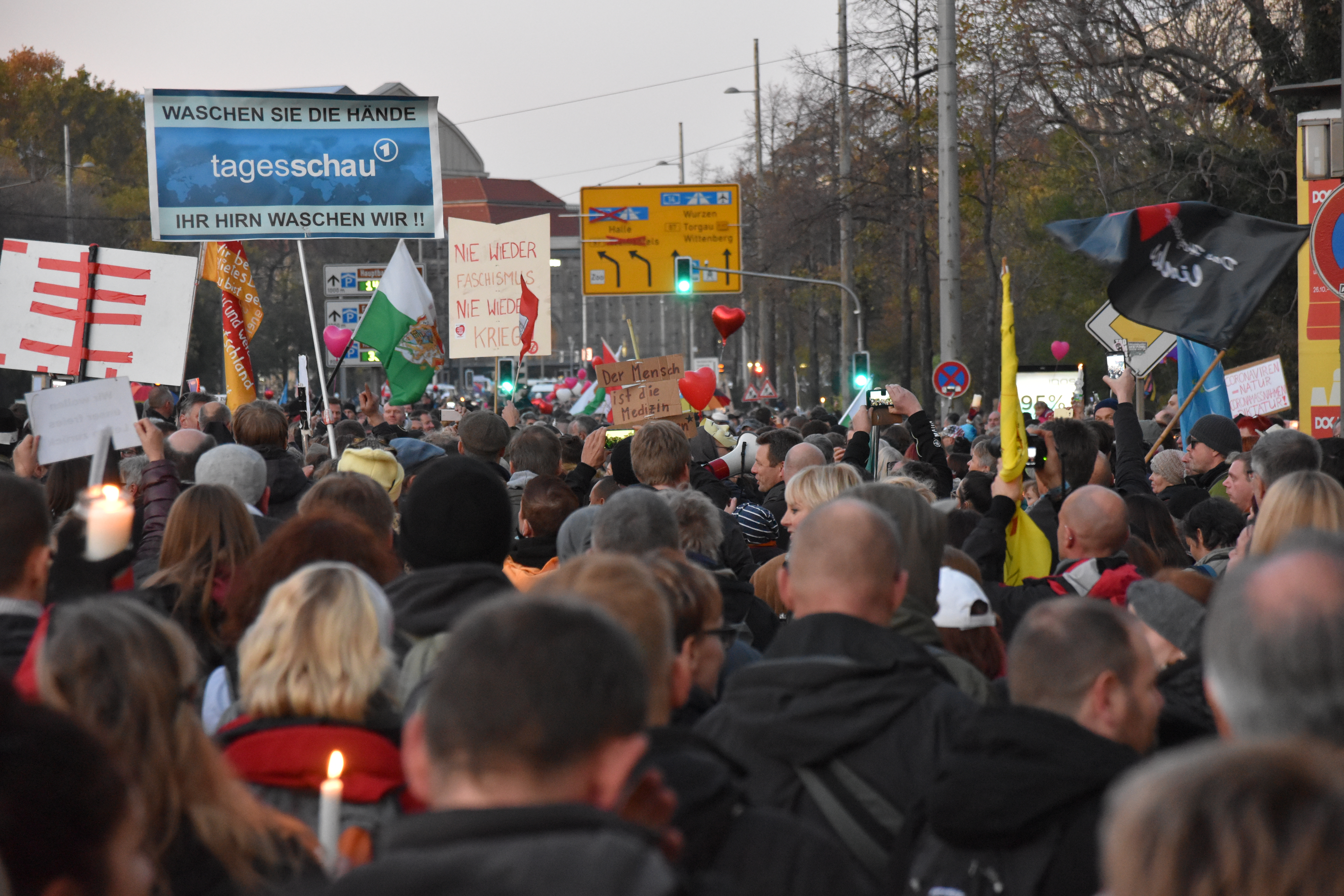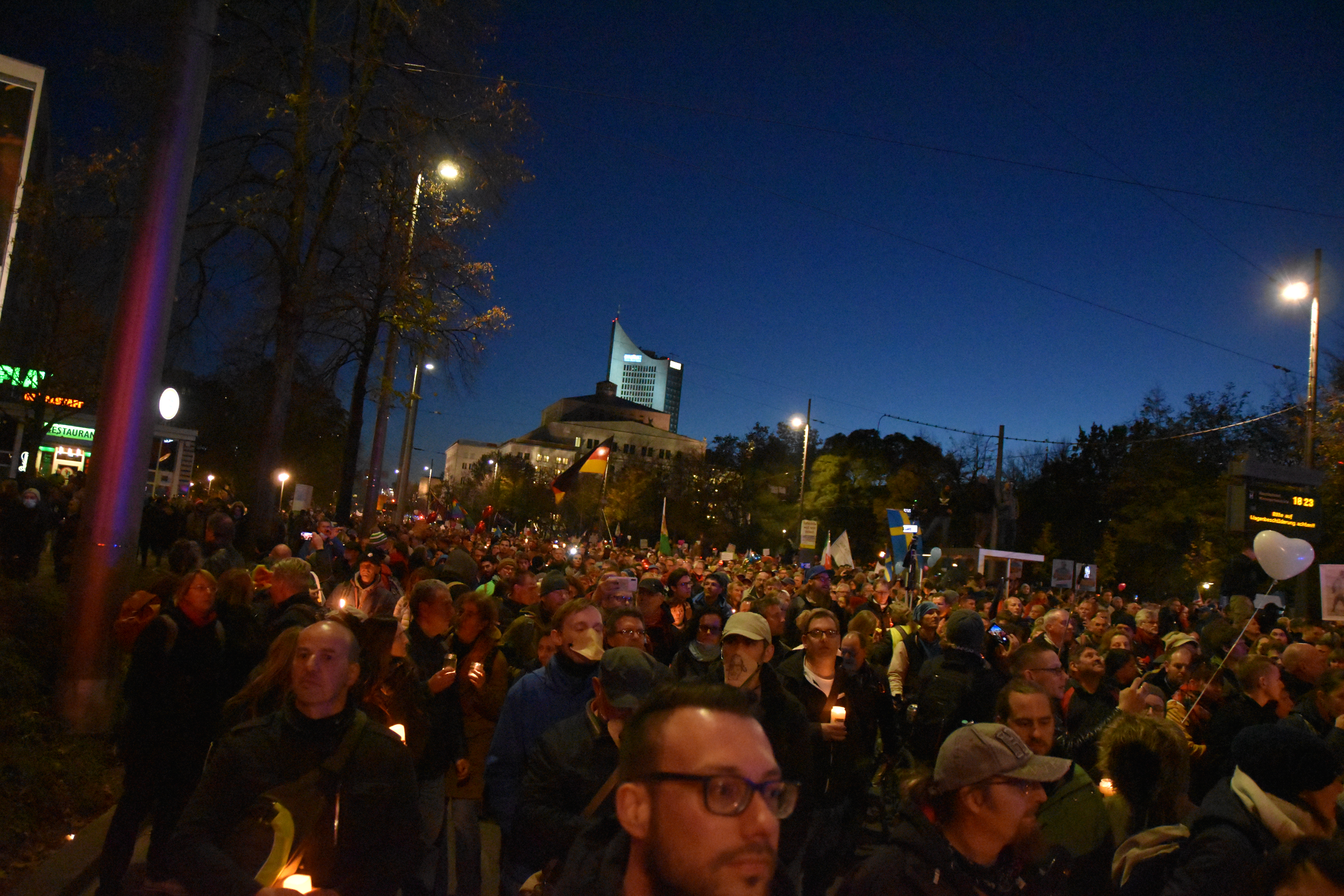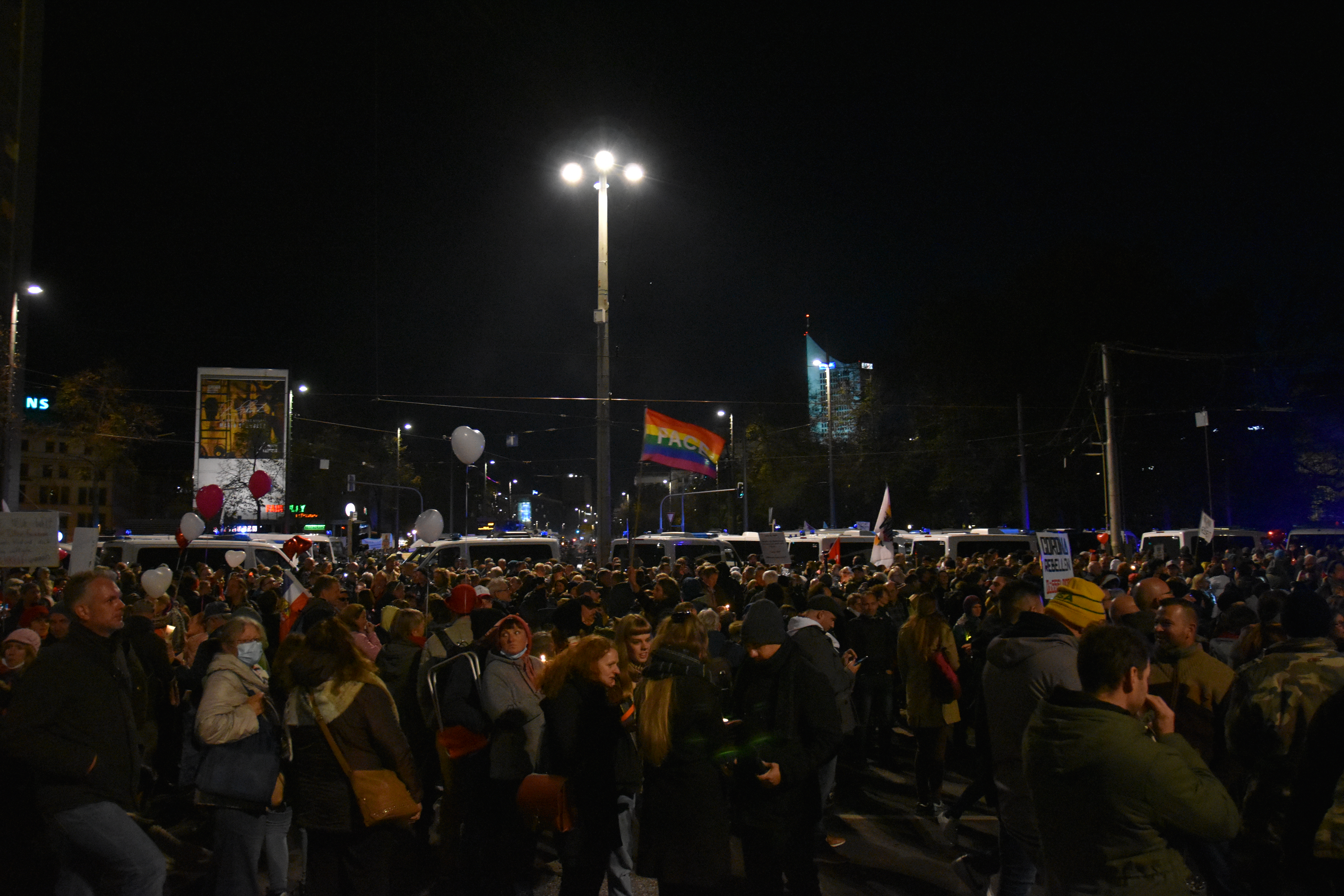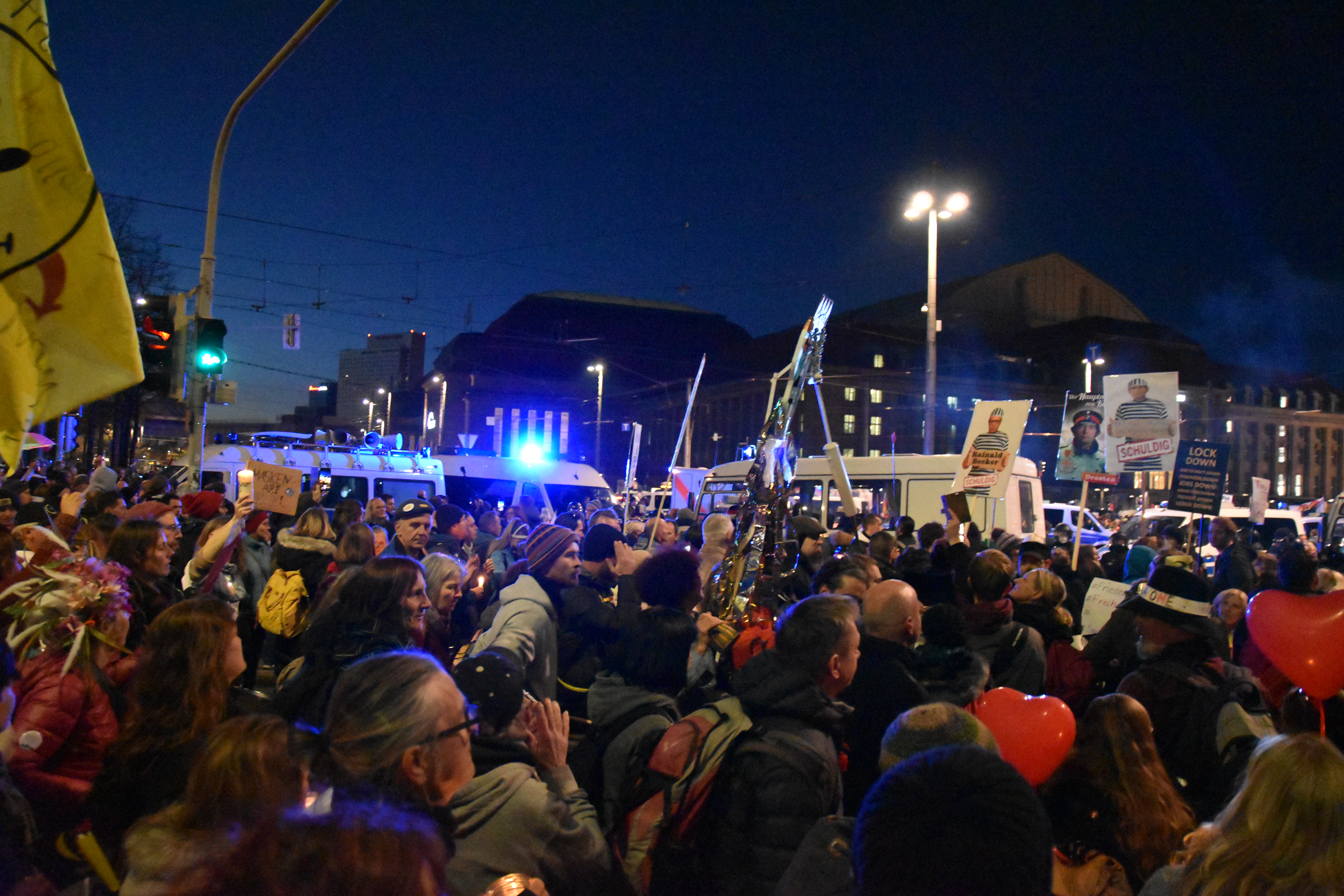 And because the police did not allow the crowd to go round the “Ring” street, as was originally scheduled for 16.00 o’clock, people started to go in circles. So there we were, 20000 or less people with candles moving in circles on a too confined space next to Augustusplatz. At that time, hygiene distance was indeed hard to maintain, but that was just after police had interfered with the organized part of the event. Was that a wise decision? Hard to tell. I guess the police has more evidence now.