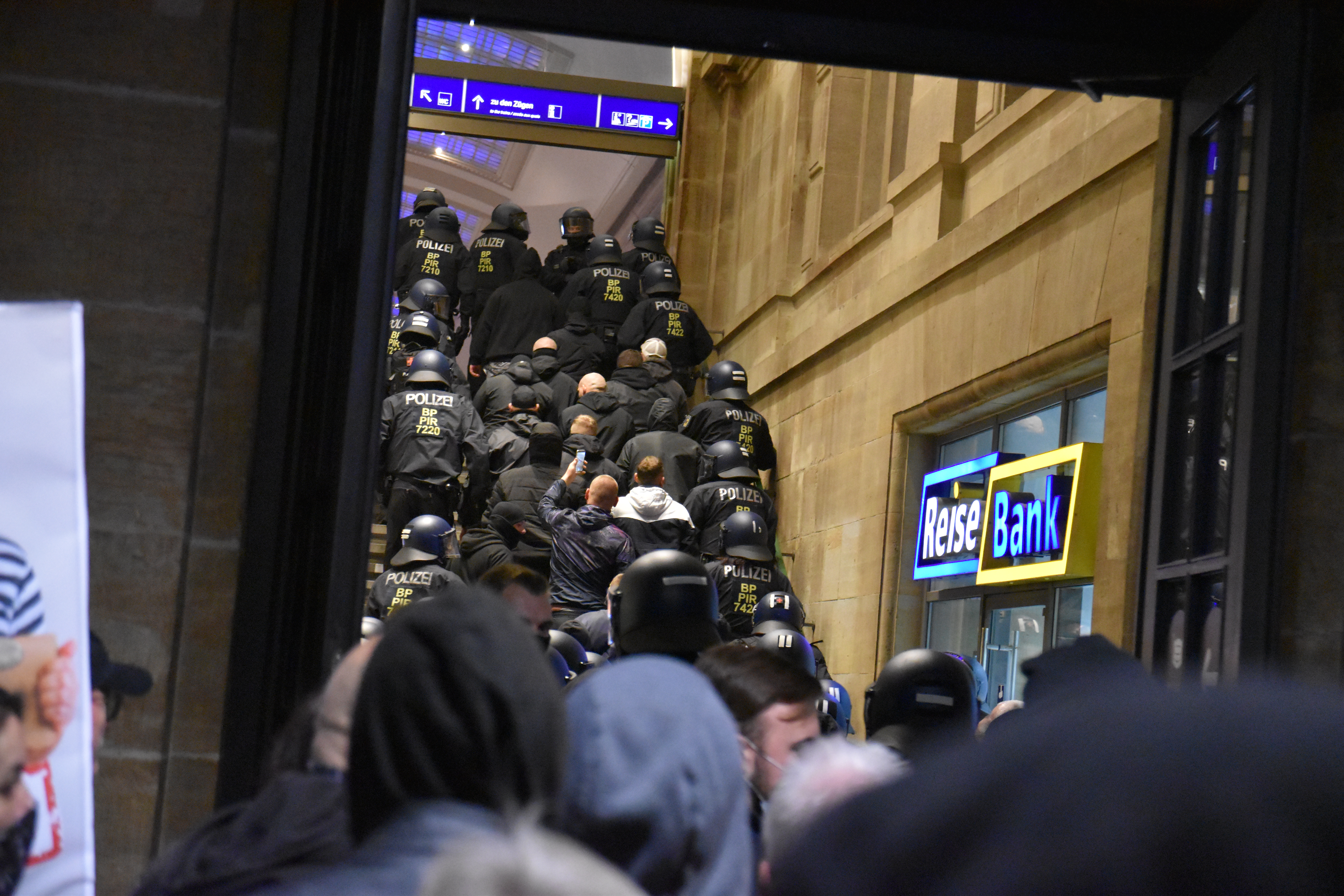 I joined a spontaneous choir of “Die Gedanken Sind Frei” and other folk songs. Realizing this could not be topped, I decided to make my way into the station and leave, one hour before the official end of the original demo. Just when I was about to enter the station, a group of about a dozen black-clothed young men was led through main station by twice the number of police officers. They advanced rather quickly, shouting paroles and taking photos with their smartphones. That was probably the weirdest scene I saw yesterday.