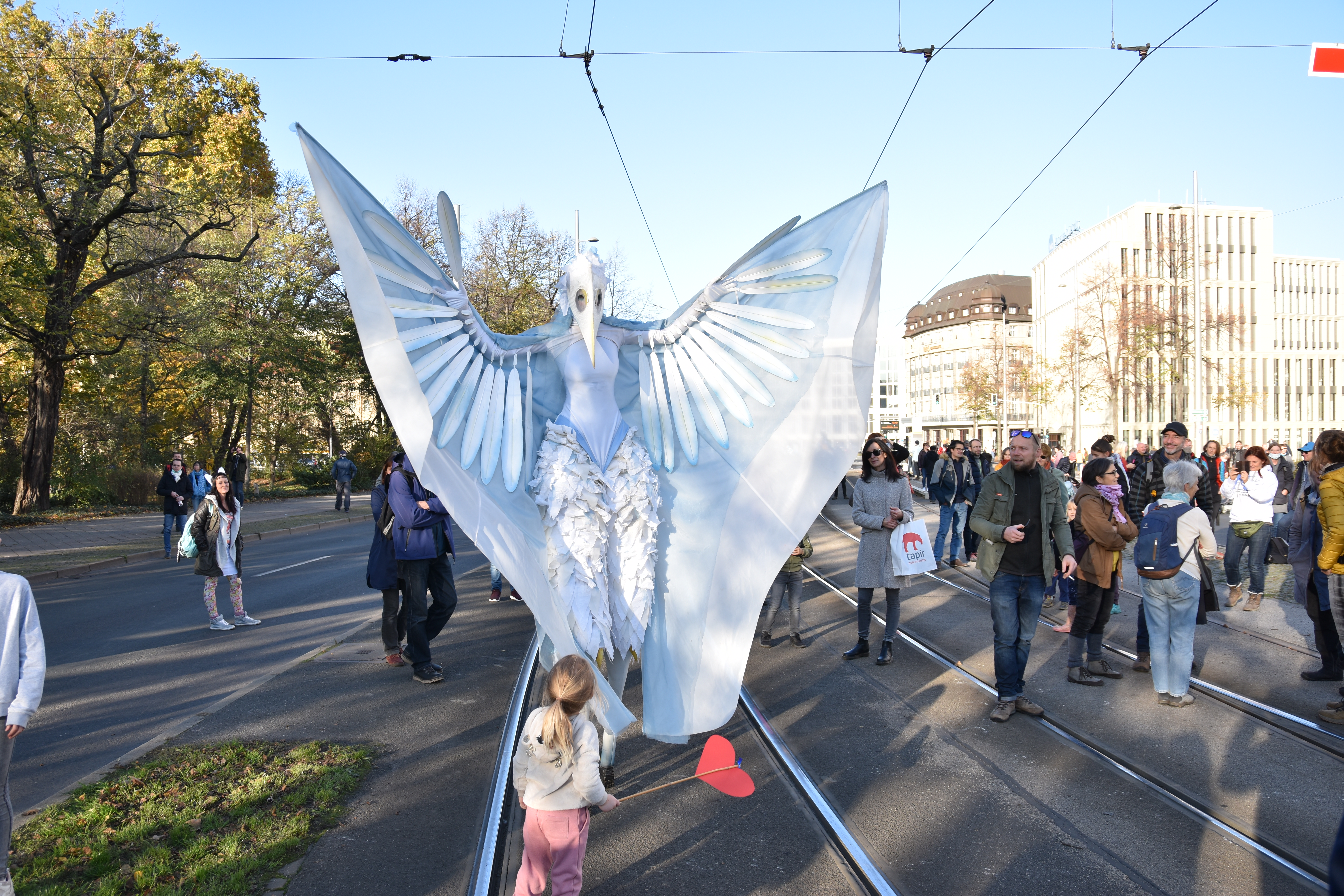 An artist came along, impersonating a huge, beautiful bird. She caught a lot of attention. As an alternative to attributing the event to political right or left, to conspiracy theorists, to ideologists, we could hypothesize that the Querdenken demo was instrumentalized by bird-humans.